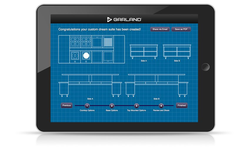 A new approach to suite engineering, Instead of taking over an existing kitchen, many chef’s dream of the day that they can create their own – designed exclusively to work the way they believe a kitchen should work. Now you can design your own suite with Garland’s Modular Island Suite App. This interactive tool features a configuration tool that enables you to choose your own style of cook tops, refrigeration, storage and ovens – and place them in their optimum location. You can even output or share your plans – your dream kitchen – one step closer to reality! The app also contains a complete product section featuring the latest in cooking technology from Induction to Accelerated Cooking ovens. If a new kitchen is in your plans – this is a must have app.